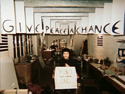 film`s title "Give Peace a Chance" hung from the ceiling above them as John & Yoko and other editors and staff posed beneath the