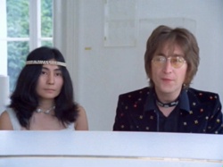 footage shows John performing the song at his white grand piano with Yoko opening up the shutters of the windows before sitting down next to him at the piano.